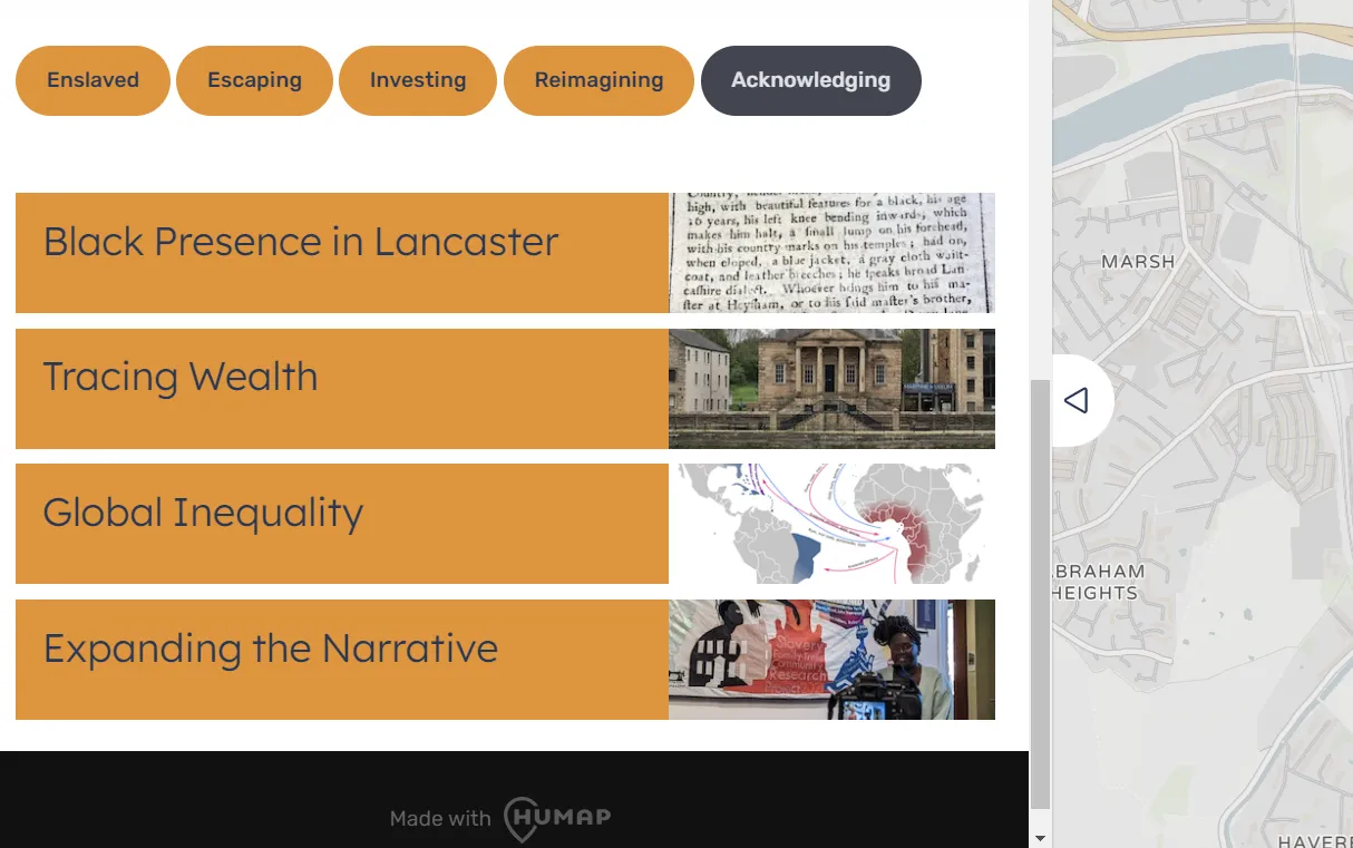 The Facing the Past digital map is an online resource that documents the complex involvement of the residents of 18th century Lancaster in trans-Atlantic slavery, and the ways that these histories have been memorialised. Traditional methods of recording history often separate people and events out into distinct, categorizable entities, based on their location or period of time. This has often prevented us from making connections, such as the wealth of a city and the origins of how that wealth was generated.